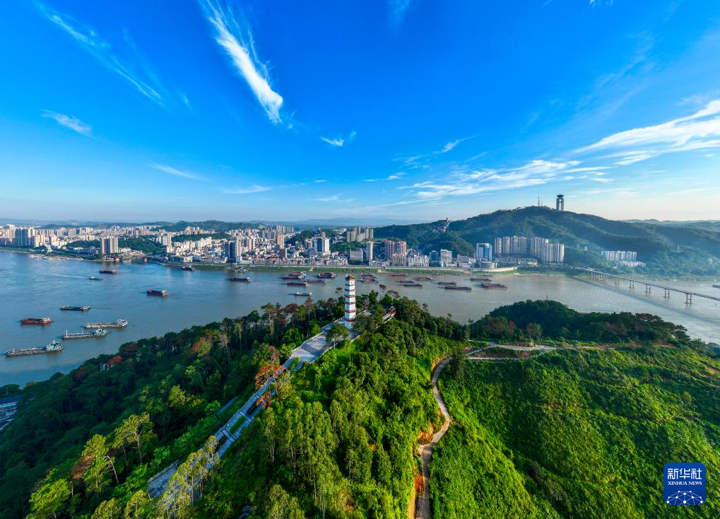 8月30日,在广西梧州市万秀区的西江航道上,船只在秋日晴空下往来穿梭(无人机照片)。
