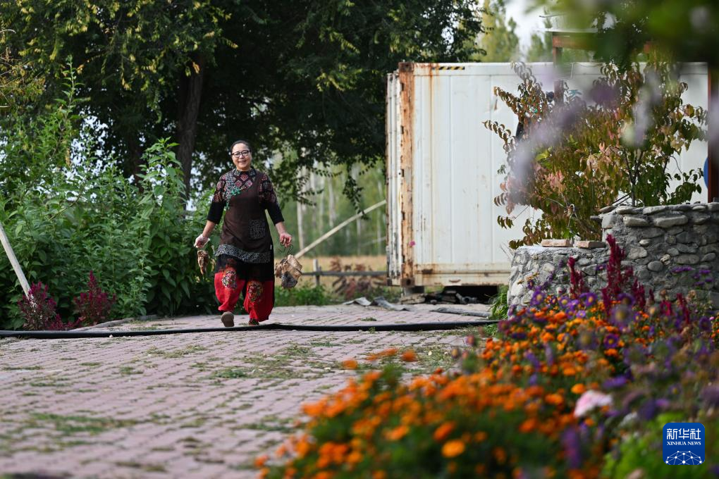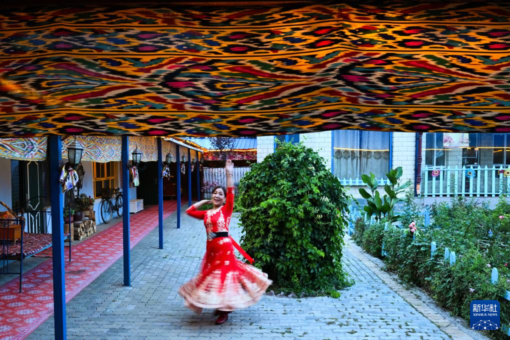 9月17日,哈萨克族客人库尔加娜在院中跳舞。