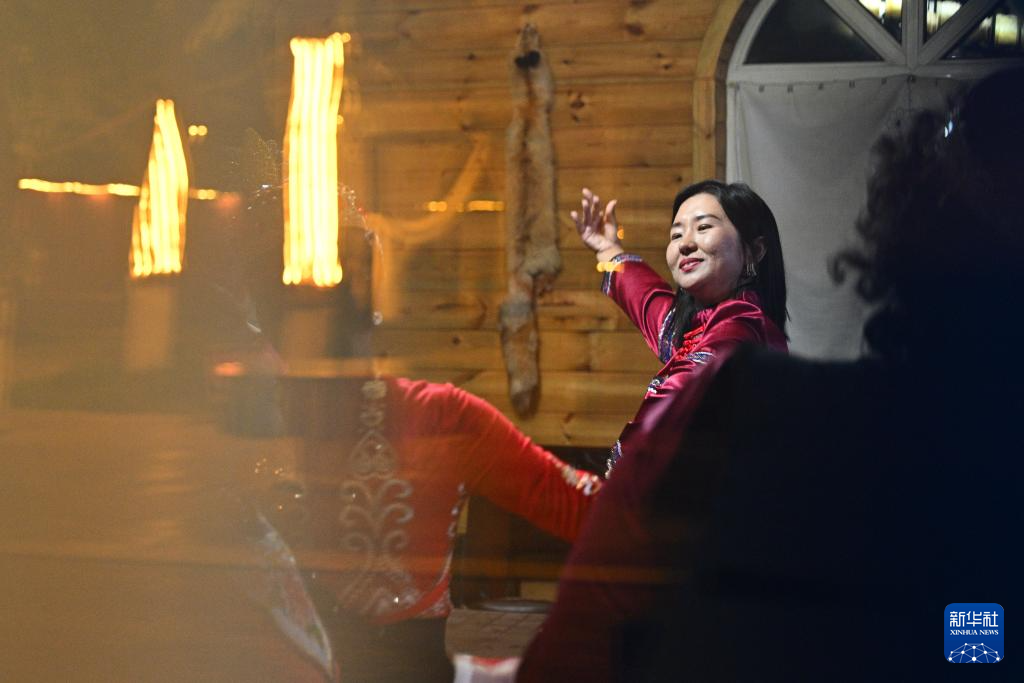 9月17日,达斡尔族客人宋瑞琪在餐后跳舞。