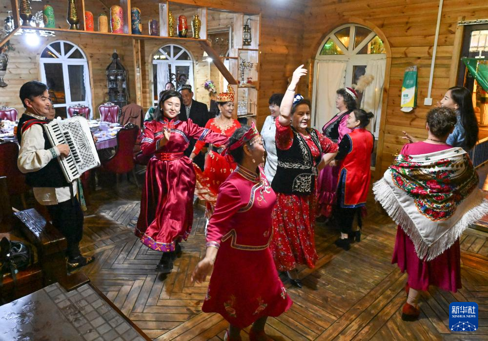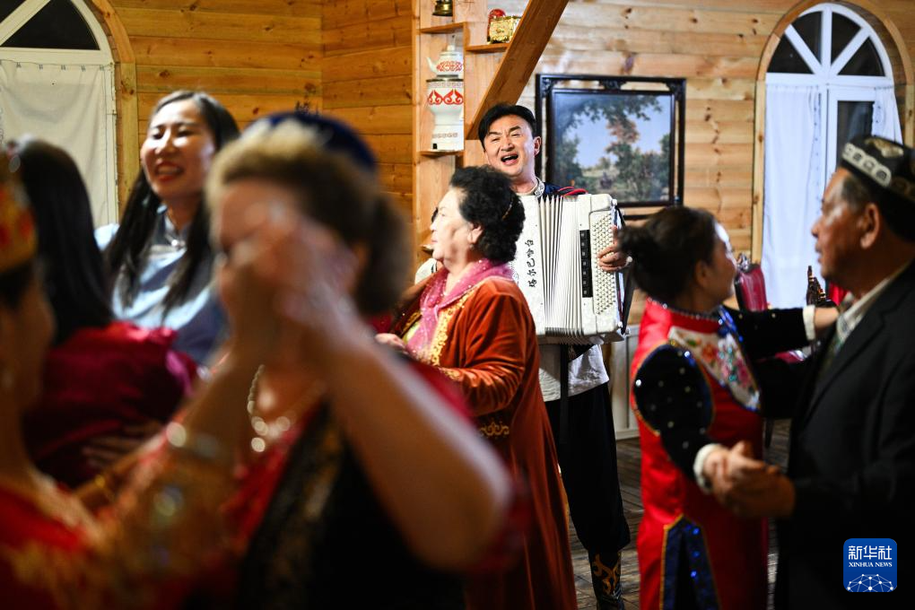 9月17日,哈萨克族客人哈加依甫·也克斯汉在餐后拉起手风琴,人们随琴声起舞。