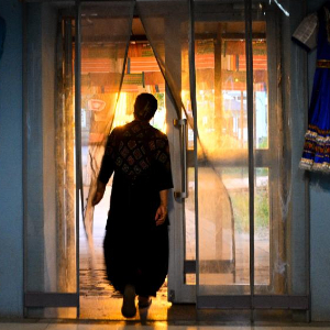 9月17日,马秀花提着风干肉走出凉房。