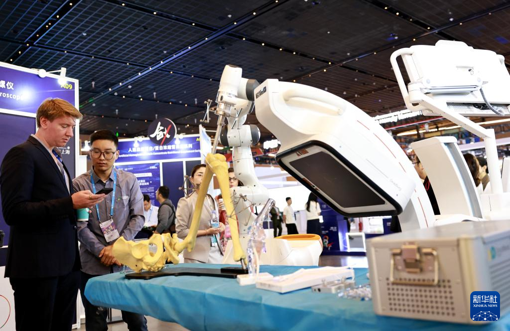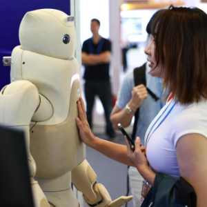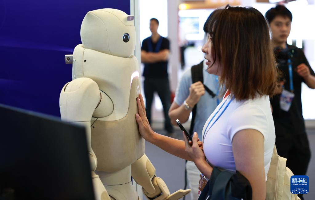 9月21日,参观者在浦江创新论坛创业投资大会现场与一个具备触感反馈功能的机器人互动。