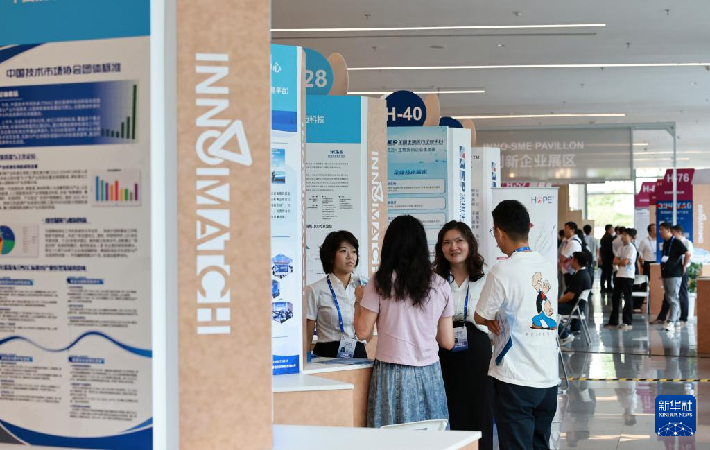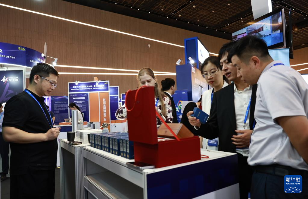 9月21日,工作人员(左二)在浦江创新论坛创业投资大会现场与参观者交流。