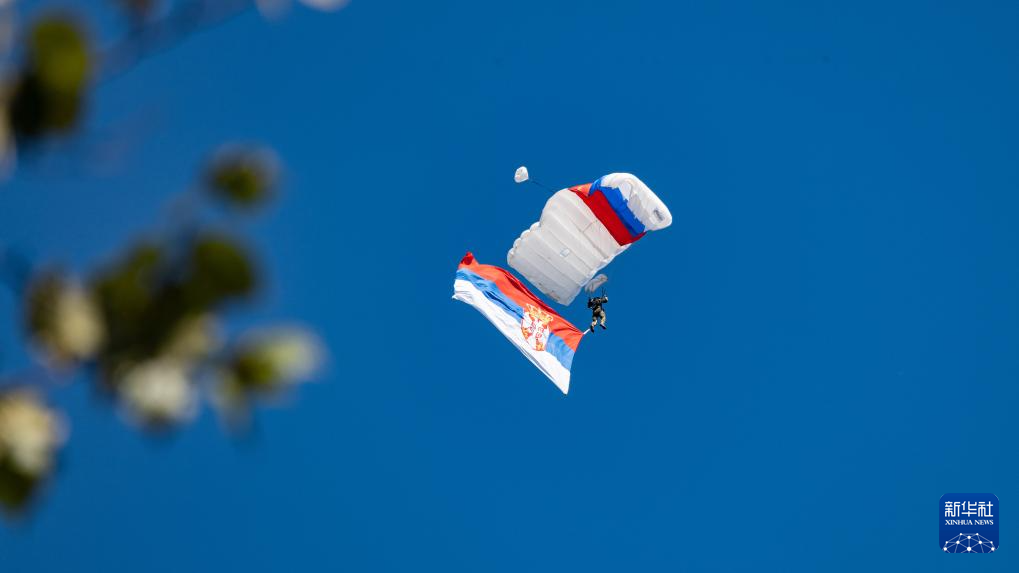 9月20日,在塞尔维亚首都贝尔格莱德,伞兵展示塞尔维亚国旗。