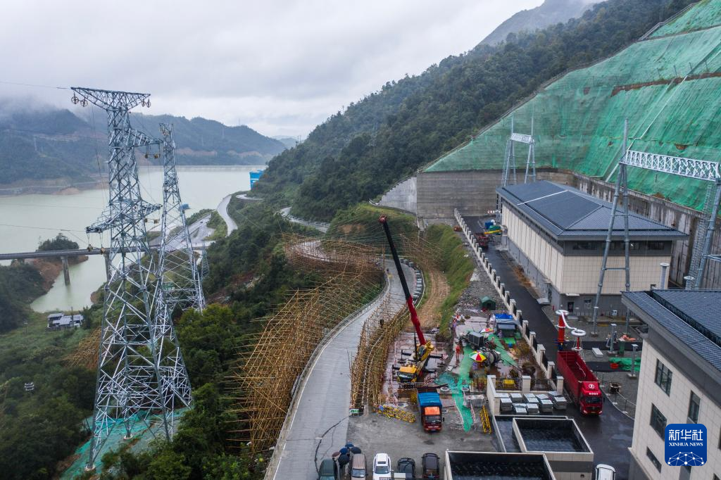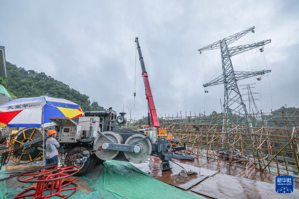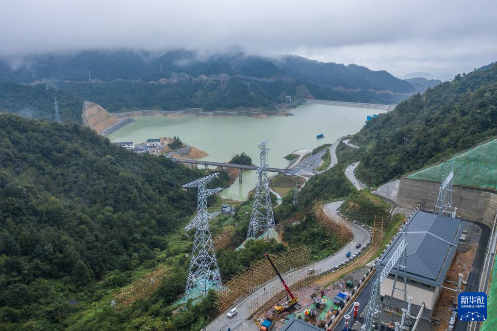 9月23日,浙江天台抽水蓄能电站的输电铁塔间在进行500千伏送出工程的输电线路架设施工(无人机照片)。
