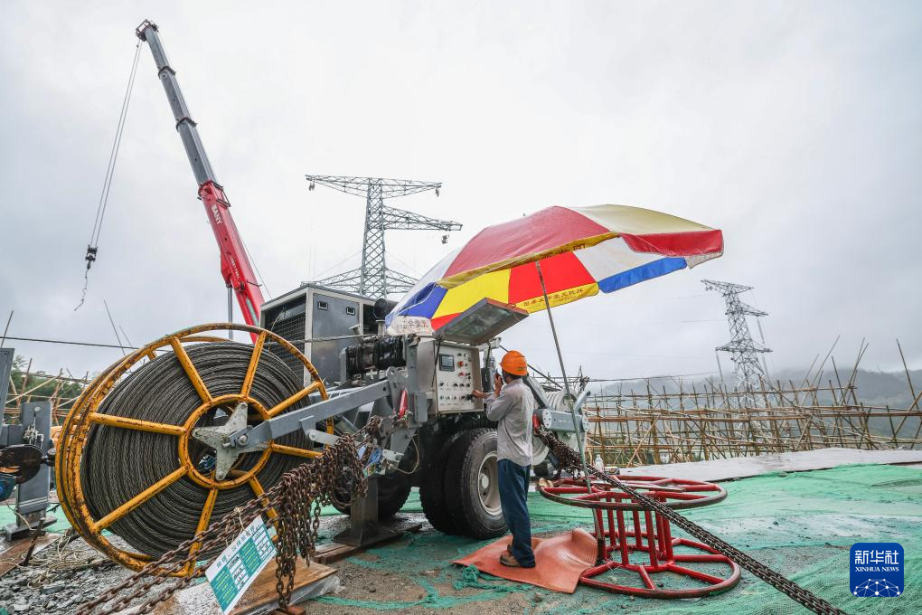 9月23日,在浙江台州坦头镇,浙江省送变电工程有限公司施工人员操作牵张机进行导地线展放工作。