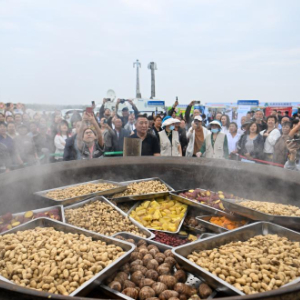 这是9月23日在天津市北辰区西堤头镇曙光水镇活动现场拍摄的为游客准备的五谷杂粮蒸食。