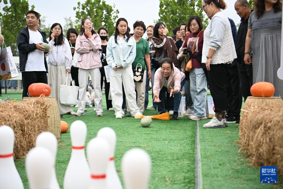 9月23日,在天津市北辰区西堤头镇曙光水镇,游客体验“南瓜保龄球”农趣活动。