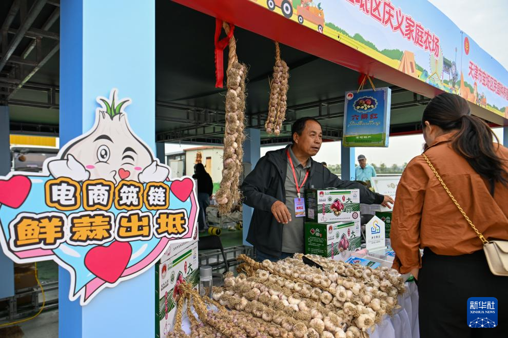 9月23日,在天津市北辰区西堤头镇曙光水镇,游客在丰收农品展示区采购特色农产品。