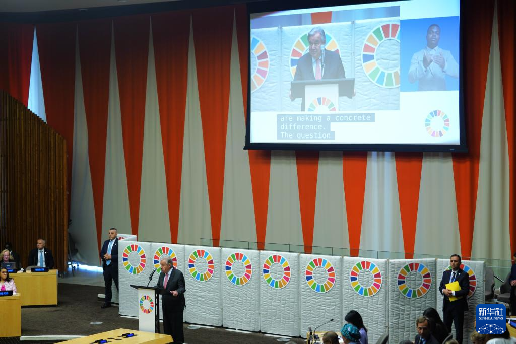 9月22日,在位于纽约的联合国总部,联合国秘书长古特雷斯在“可持续发展目标时刻”活动上发表讲话。