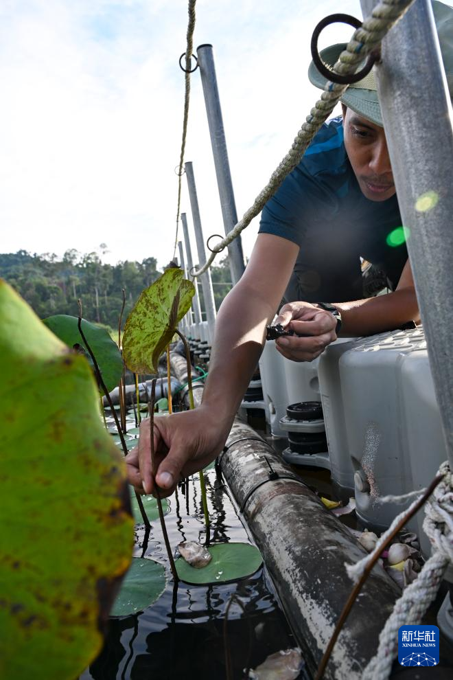9月3日,在马来西亚彭亨州珍尼湖生物圈保护区,保护区研究员依冠照料他培育的荷花。