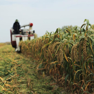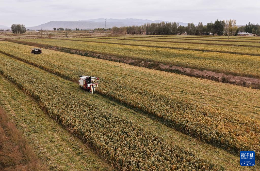 9月24日,收割机在甘肃省张掖市山丹县位奇镇暖泉村收割谷子(无人机照片)。