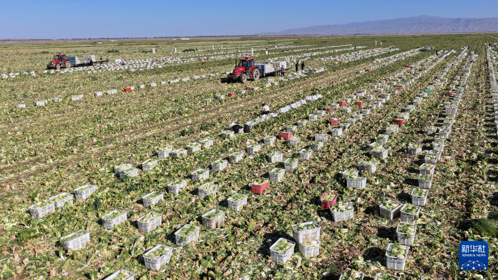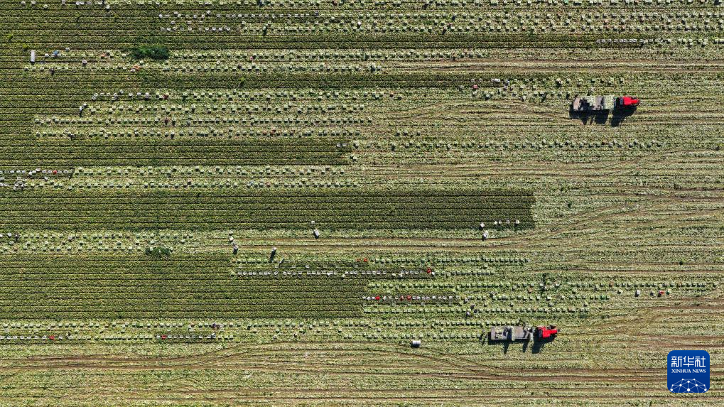 9月23日,菜农在甘肃山丹马场蔬菜基地里收获蔬菜(无人机照片)。