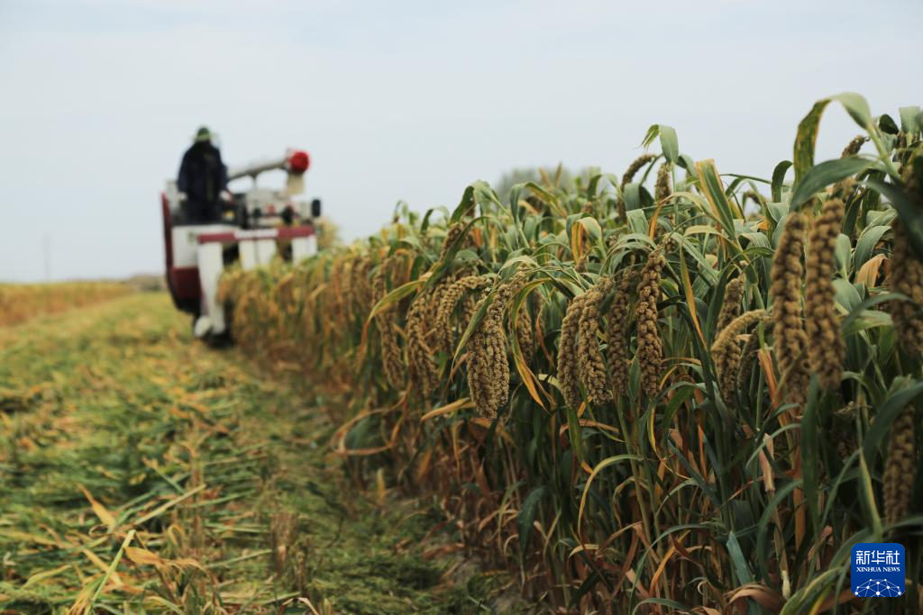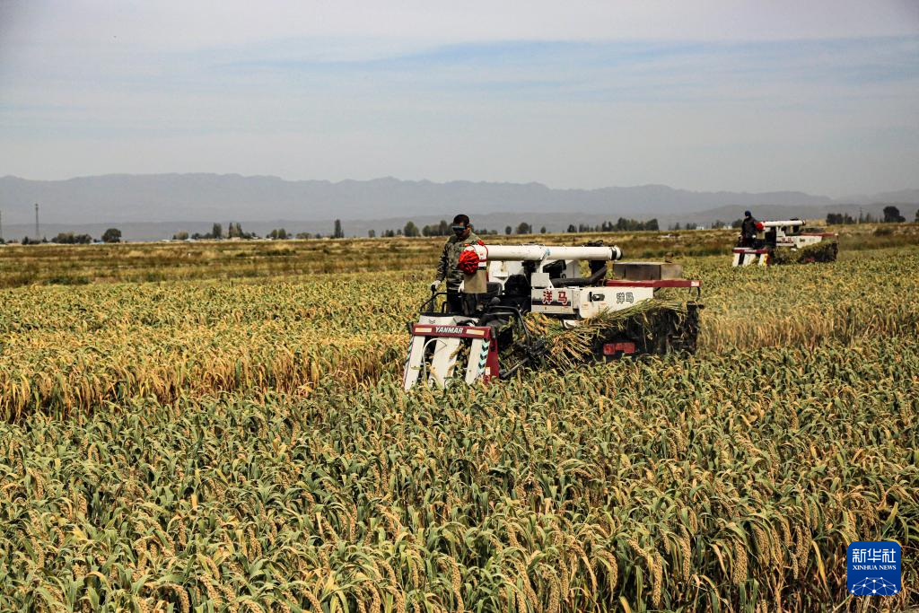9月24日,收割机在甘肃省张掖市山丹县位奇镇暖泉村收割谷子。