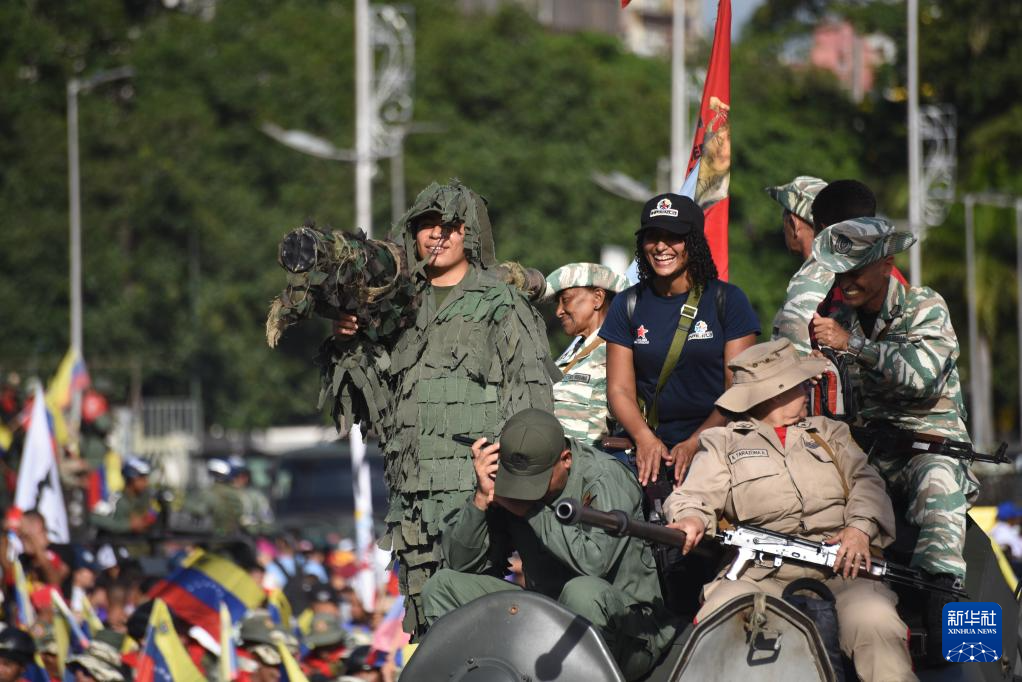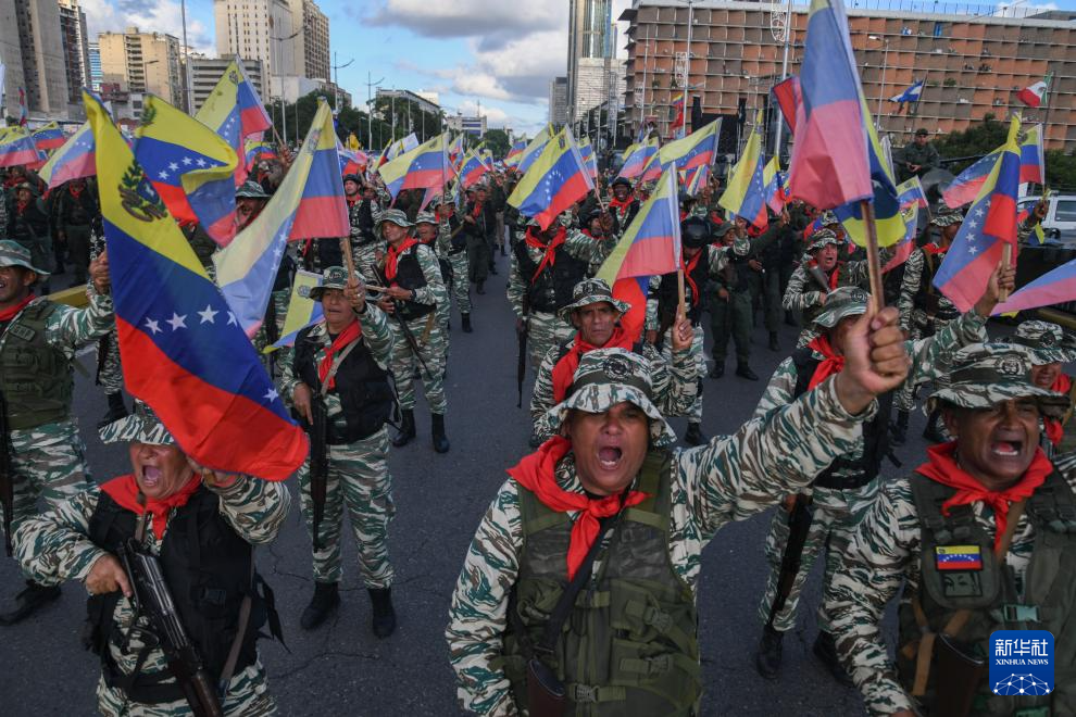 9月23日,在委内瑞拉首都加拉加斯,民兵组织成员挥舞委内瑞拉国旗参加游行。