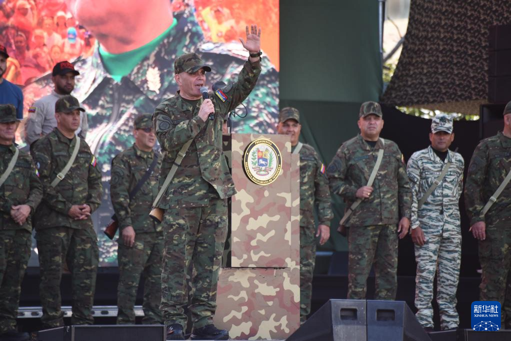 9月23日,在委内瑞拉首都加拉加斯,委内瑞拉国防部长洛佩斯(前)在游行集会上发表讲话。