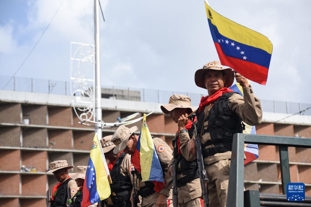 9月23日,在委内瑞拉首都加拉加斯,参加游行活动的民众和军事人员在高呼口号。