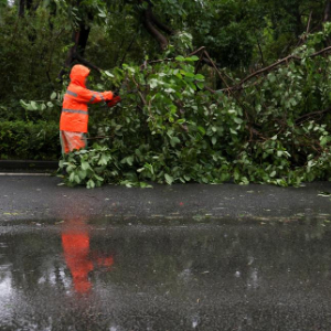 9月24日,环卫工人在深南大道清理倒伏的树木。