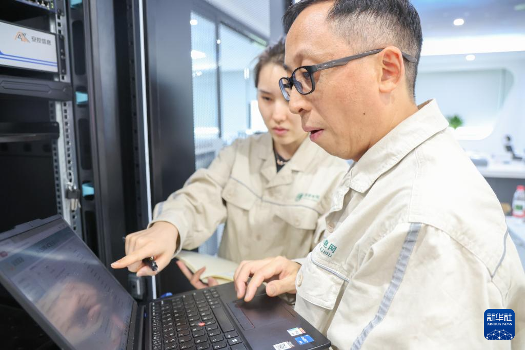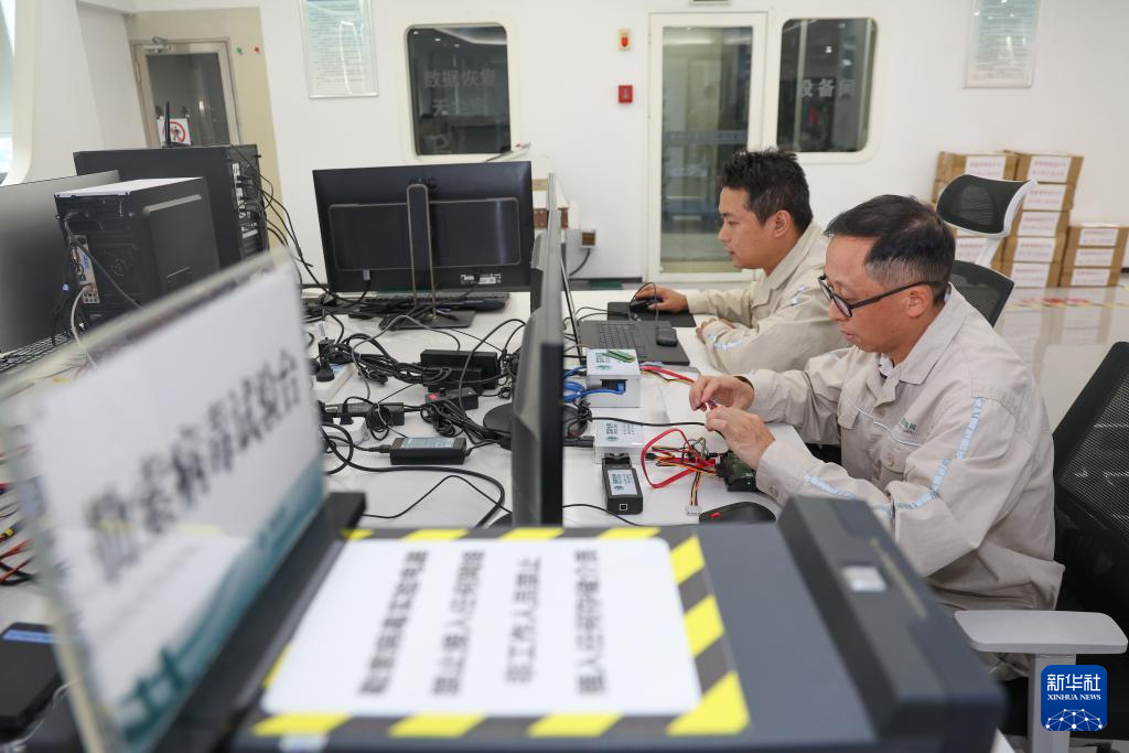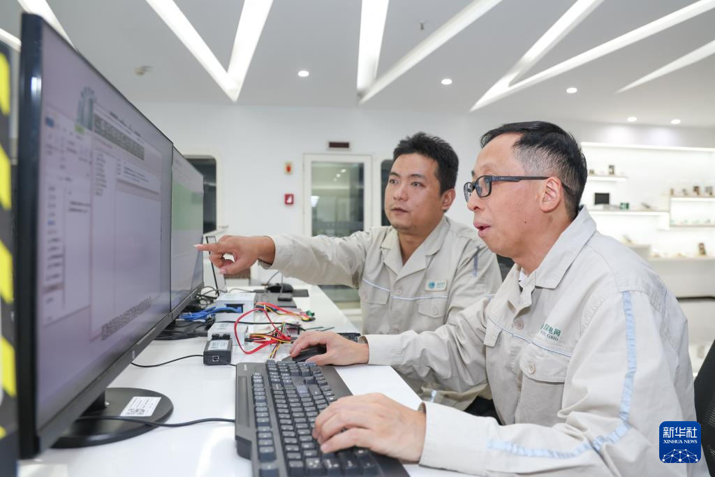 9月19日,在国网重庆市电力公司电力科学研究院,韩世海(右)带领团队年轻成员对设备进行安全检查。