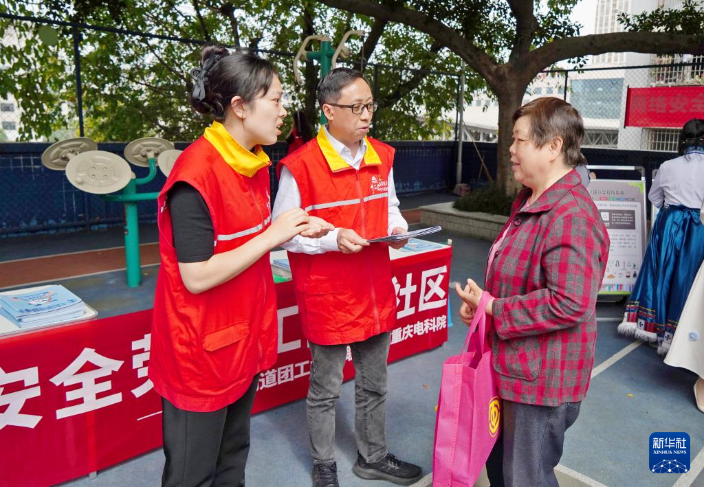 4月15日,在重庆市渝北区,韩世海(中)在汪家桥社区开展网络安全宣传活动。
