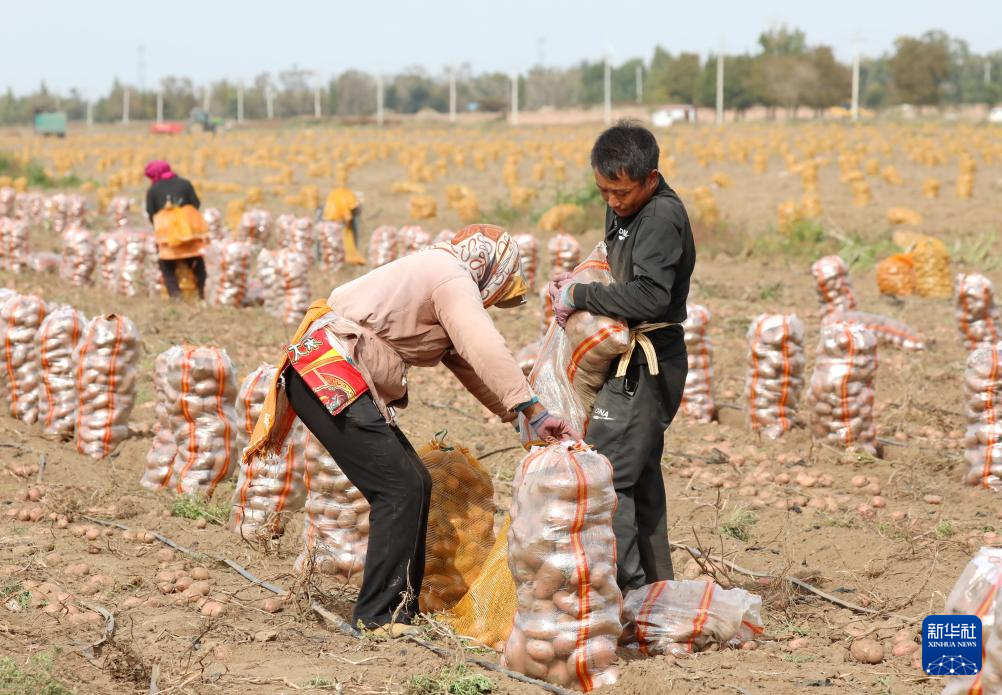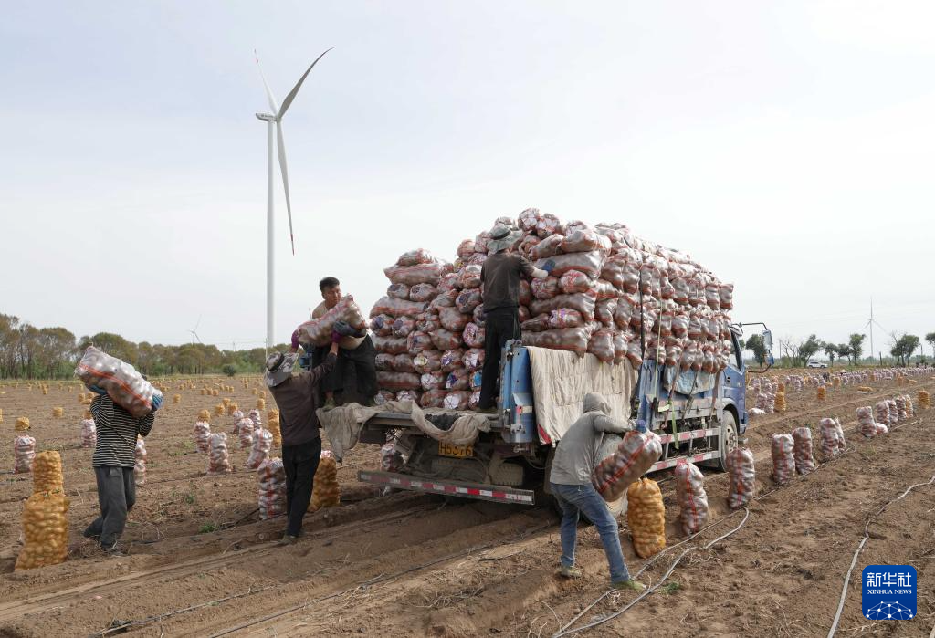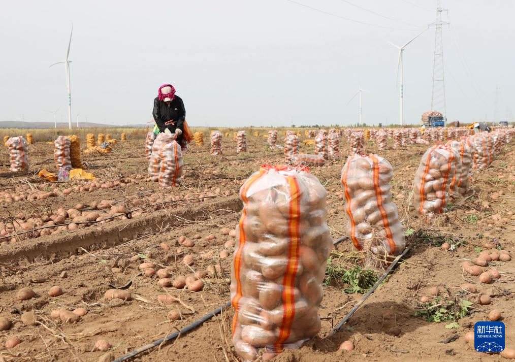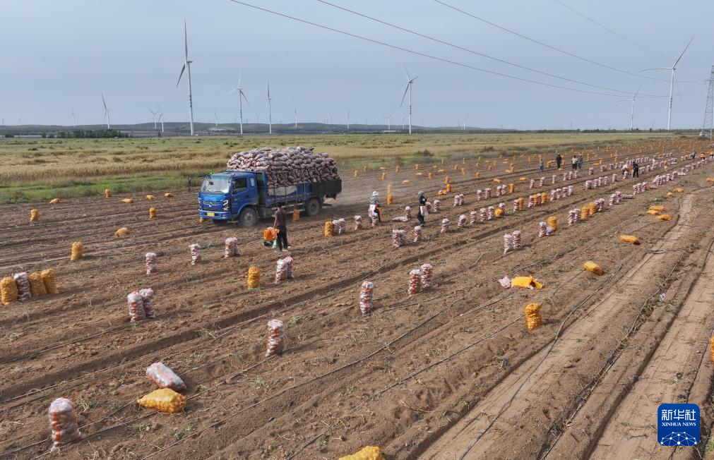9月25日,河北省张家口市察北管理区一家马铃薯种植合作社的社员在田间收获马铃薯。