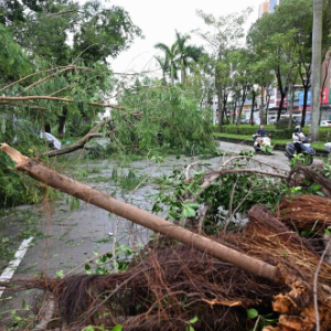 9月25日,在广东阳江市阳东区的228国道,公路局工作人员在清理倒伏树木。