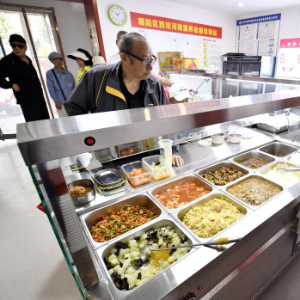 9月26日,朝阳区香河园街道的居民在老年餐厅购买午餐。