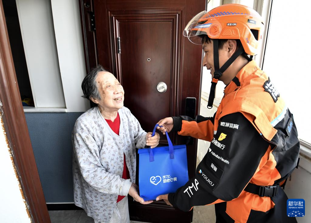9月26日,朝阳区香河园街道蓝骑士驿站的配送员为一位独居老人送餐上门。