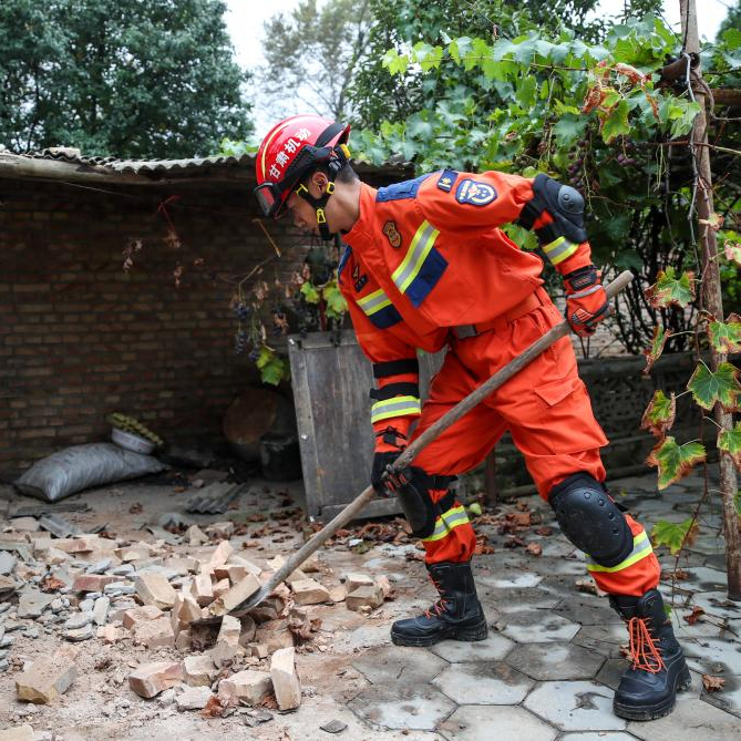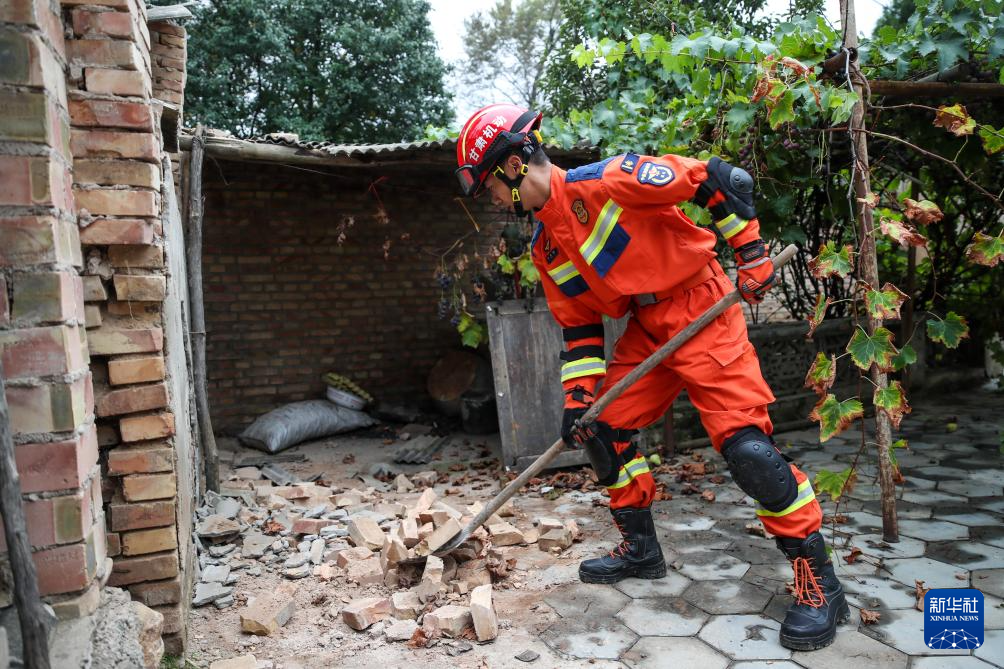 9月27日,在陇西县文峰镇桦林村,森林消防救援人员在清理村民家里掉落的砖块。