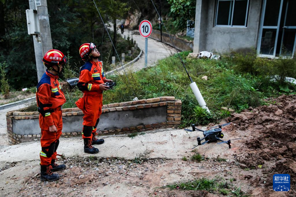 9月27日,在陇西县文峰镇桦林村,森林消防救援人员准备使用无人机摸排灾情。