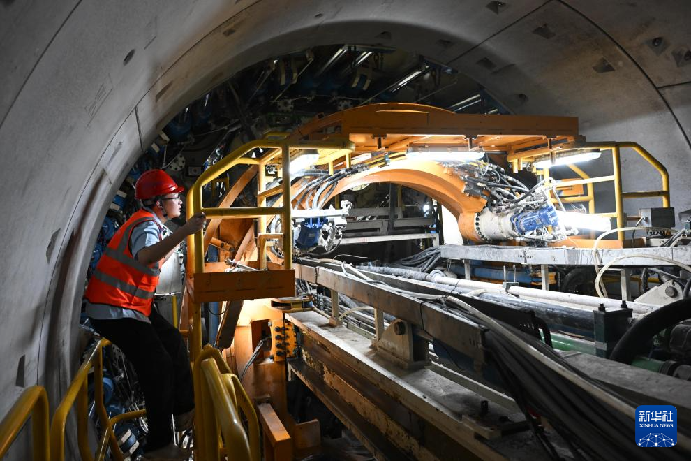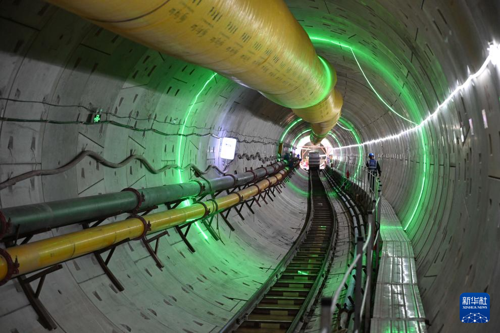 9月28日,在广东廉江的环北部湾广东水资源配置工程盾构隧洞内,中铁十二局工人在巡视。