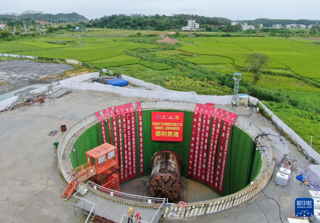 9月28日在广东廉江的施工现场拍摄的“粤海环北8号”盾构机顺利贯通环北部湾广东水资源配置工程首个盾构区间(无人机照片)。