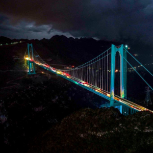 花江峡谷大桥是贵州六枝至安龙高速公路的控制性工程,大桥全长2890米,主跨1420米,是目前世界山区峡谷第一大跨度钢桁梁悬索桥;其桥面距水面垂直高度625米,超越北盘江第一桥成为新的世界第一高桥,被誉为“横竖都是第一”。在不同时段的光线下,世界第一高桥呈现出不同的美景。