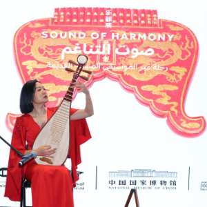 这是9月28日在沙特阿拉伯首都利雅得拍摄的“天地同和——中国古代乐器展”开幕式上的琵琶演奏表演。