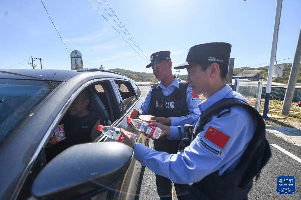 9月27日,吉林出入境边防检查总站广坪边境派出所民警在G331执勤点对驾驶员进行安全提示,并送上便民物资。