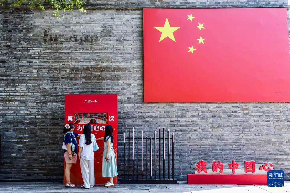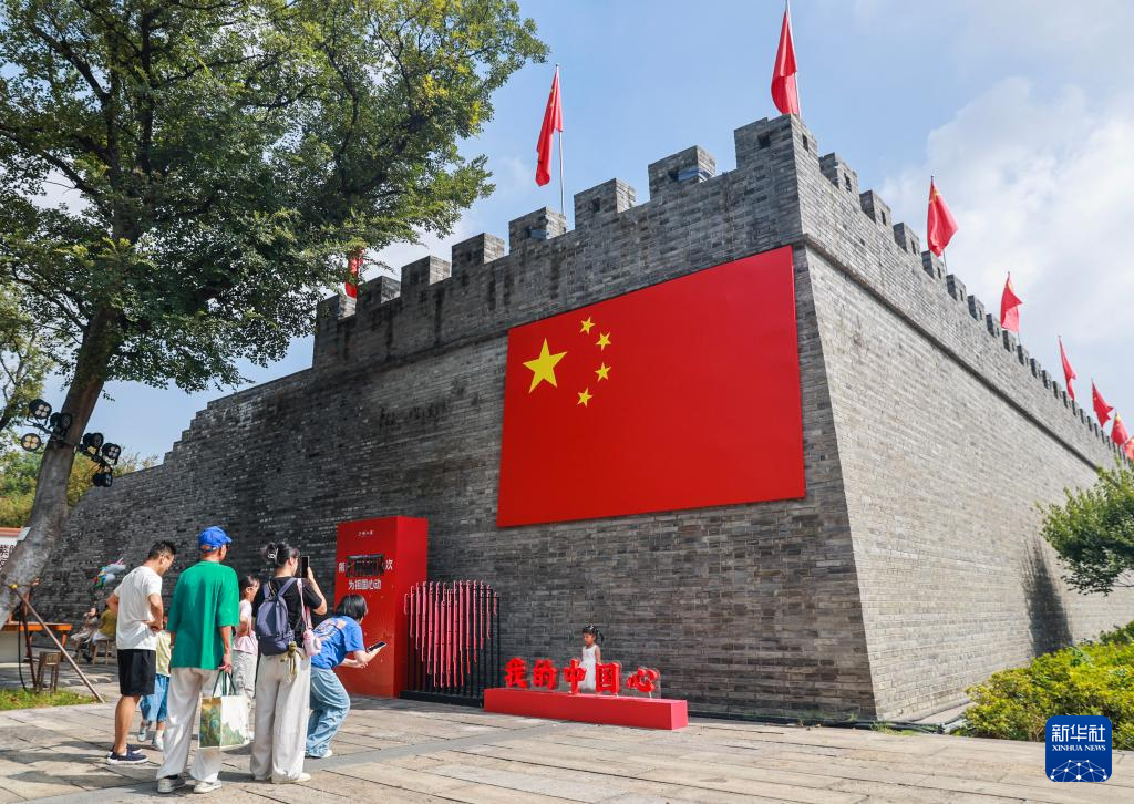 10月1日,在浙江嘉兴市南湖区建设街道子城城墙边,市民参加我为祖国心动打卡活动。