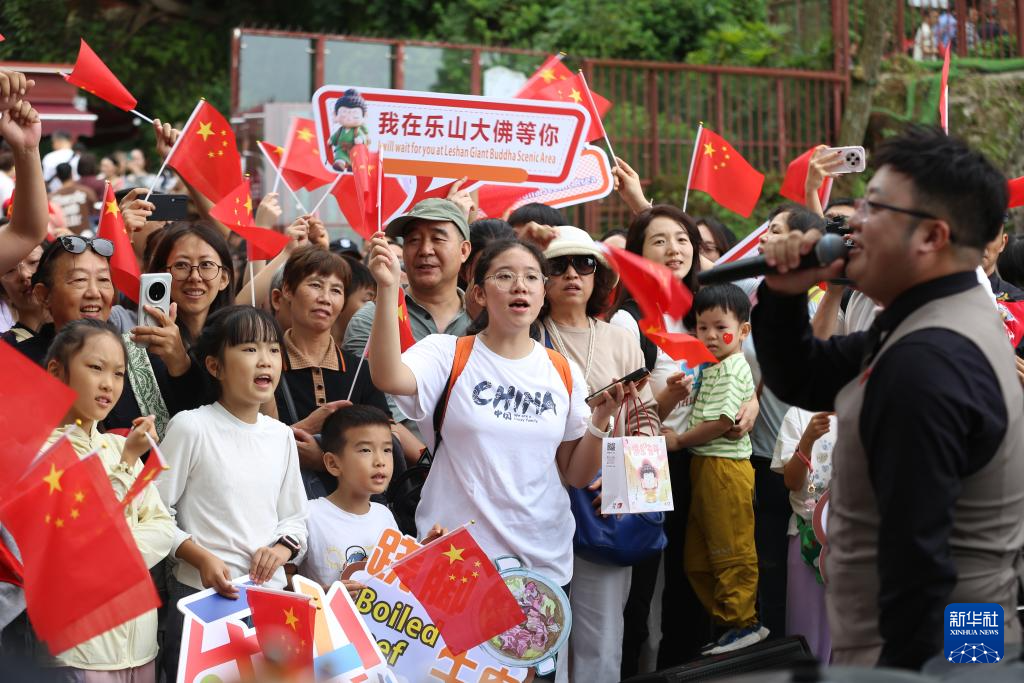 10月1日,游客在四川省乐山市大佛景区佛头广场合唱歌曲《我和我的祖国》。