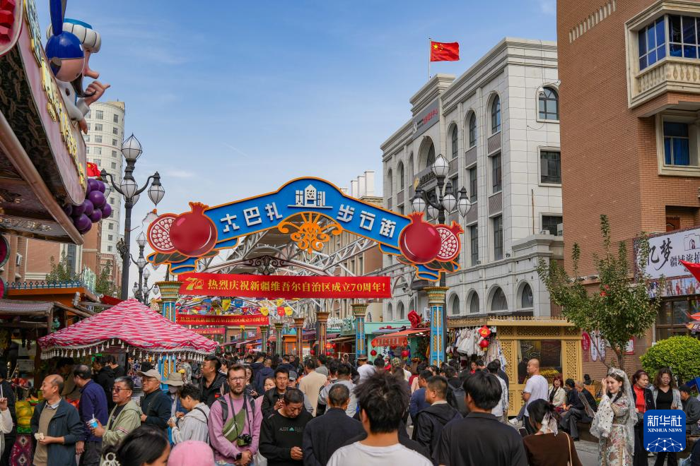 10月1日,游客在新疆乌鲁木齐国际大巴扎游玩。