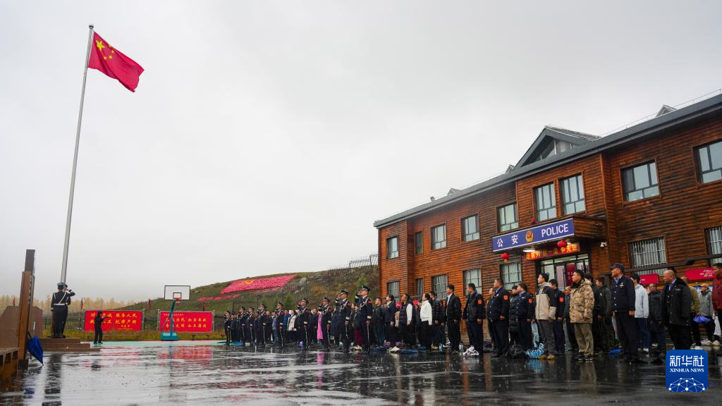10月1日在新疆阿勒泰边境管理支队喀纳斯边境派出所拍摄的升旗仪式。
