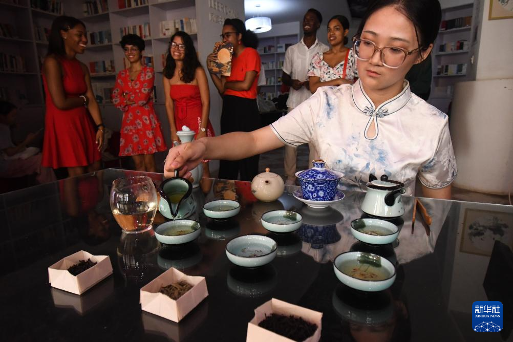9月30日,在古巴首都哈瓦那,哈瓦那大学孔子学院的一名中国教师在“茶和天下·雅集”活动中表演茶道。