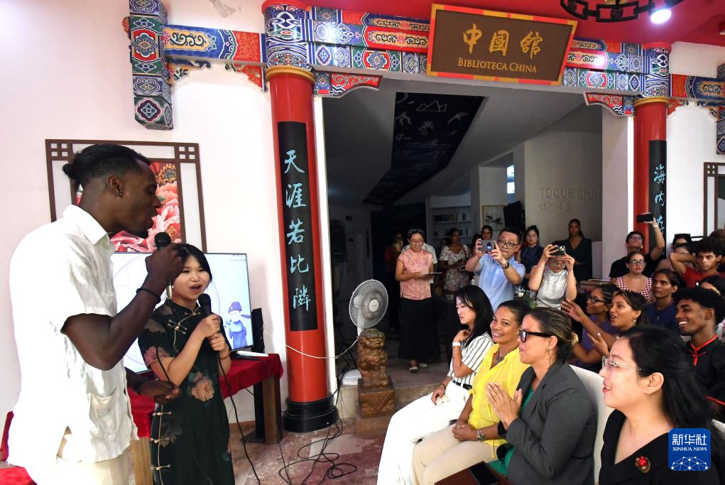 9月30日,在古巴首都哈瓦那,一名古巴学生(左一)与哈瓦那大学孔子学院的一名中国教师(左二)在“茶和天下·雅集”活动中合作演唱歌曲。