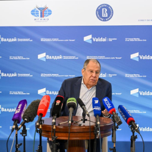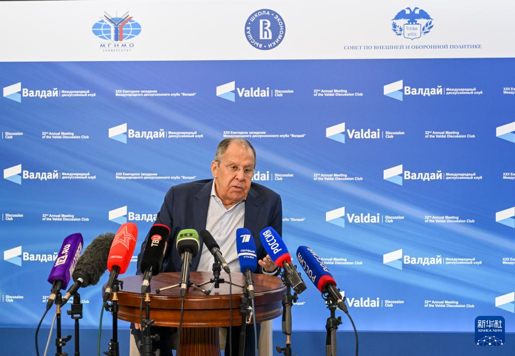 9月30日,俄罗斯外交部长拉夫罗夫在索契举办的俄智库瓦尔代国际辩论俱乐部第22届年会会场回答新华社记者提问。