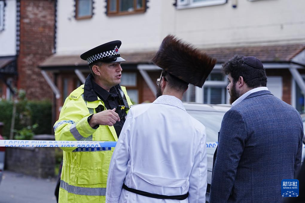 10月2日,警察(左)在英国曼彻斯特的犹太教堂袭击事件现场工作。