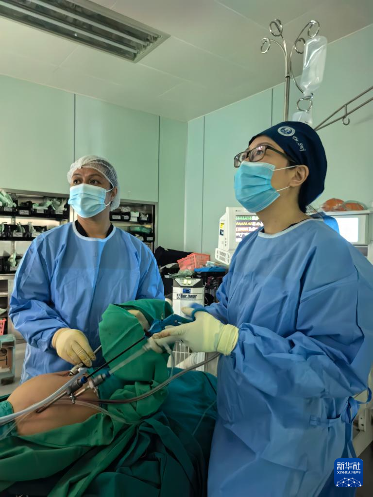 9月12日,在萨摩亚首都阿皮亚的萨摩亚国立医院,第10批中国援萨摩亚医疗队妇科专家邵文静(右)为患者实施妇科腹腔镜手术。