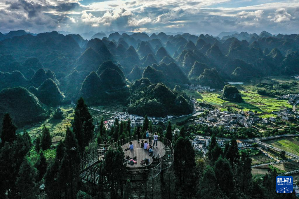 10月3日,游客在贵州省兴义市万峰林景区观景台游玩(无人机照片)。
