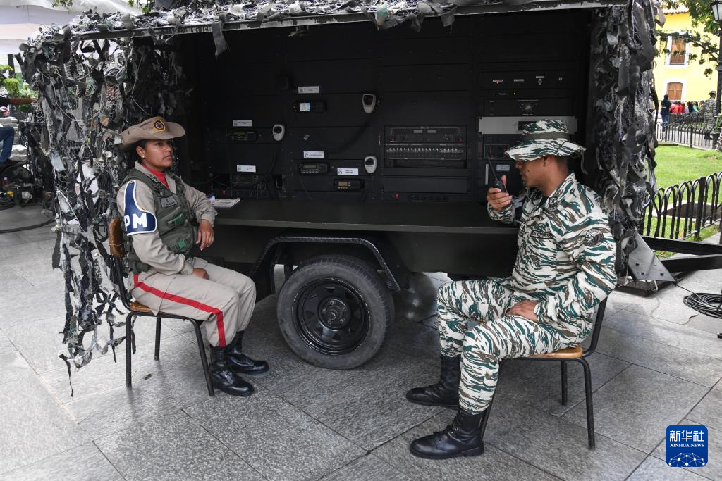 10月4日,在委内瑞拉首都加拉加斯的玻利瓦尔广场,玻利瓦尔民兵组织成员操作通信设备。