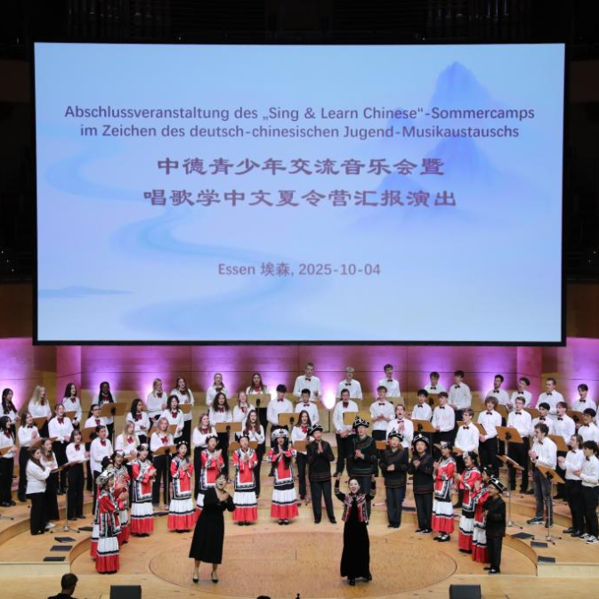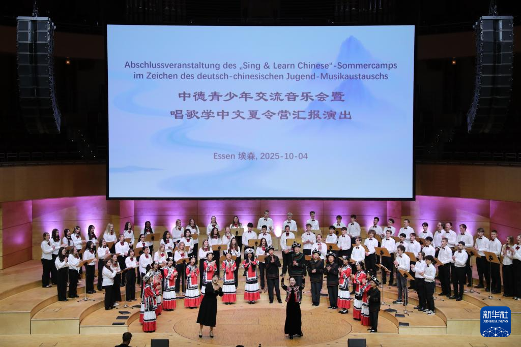 中德青少年交流音乐会暨“唱歌学中文”夏令营汇报演出4日在德国埃森市举行。来自德国伯乐中文合唱团、云南大学及其附属中学的师生携手登台,用音乐传递友谊,交流多元文化,共同表达对未来的美好期待。
