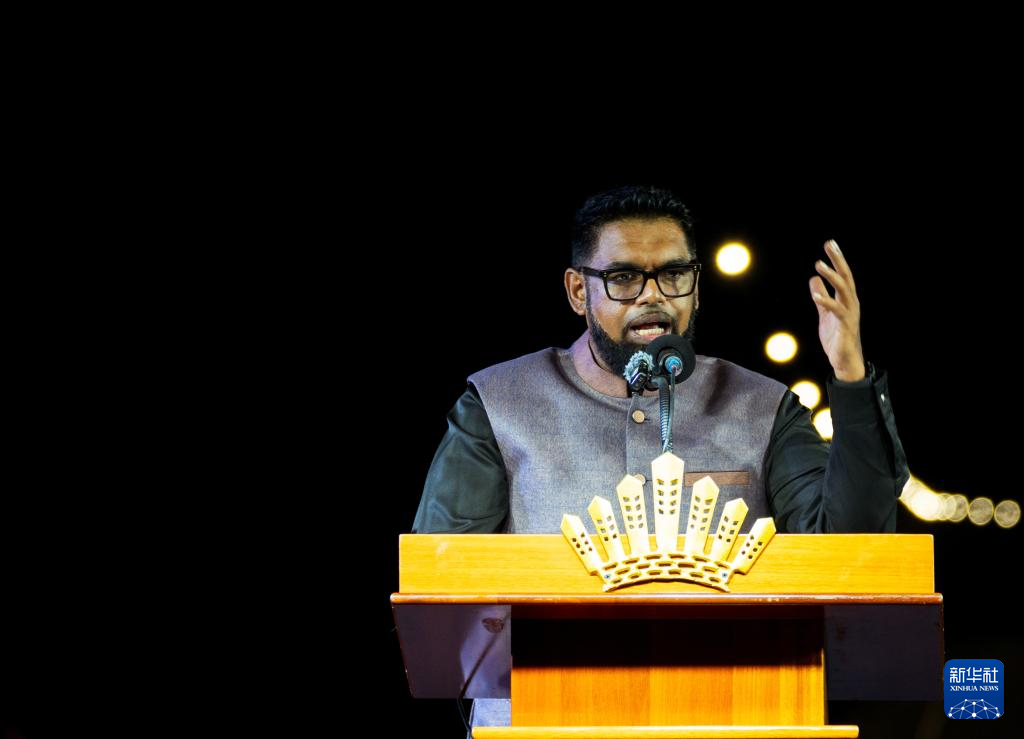 10月5日,在圭亚那首都乔治敦,圭亚那总统阿里在巴拉特·贾格迪奥-德梅拉拉河大桥通车仪式上讲话。
