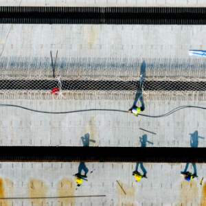 10月6日,在湖南省衡阳市雁峰区南三环路上,湖南雁能建设集团有限公司的施工人员在高塔进行架线施工作业(无人机照片)。
