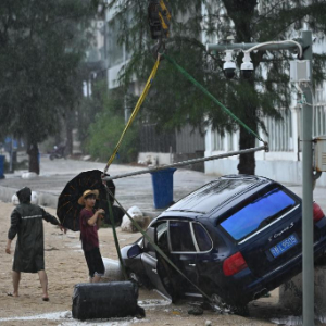 10月6日,在北海市海城区北岸海堤,人们对一辆被台风刮翻的小汽车施救。